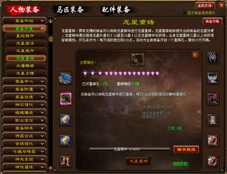 当角色每日活跃度达到 120 点时,全身装备将自动开启 1 个龙星重铸孔位,装备重铸孔位数量最高可开启至 15 孔。