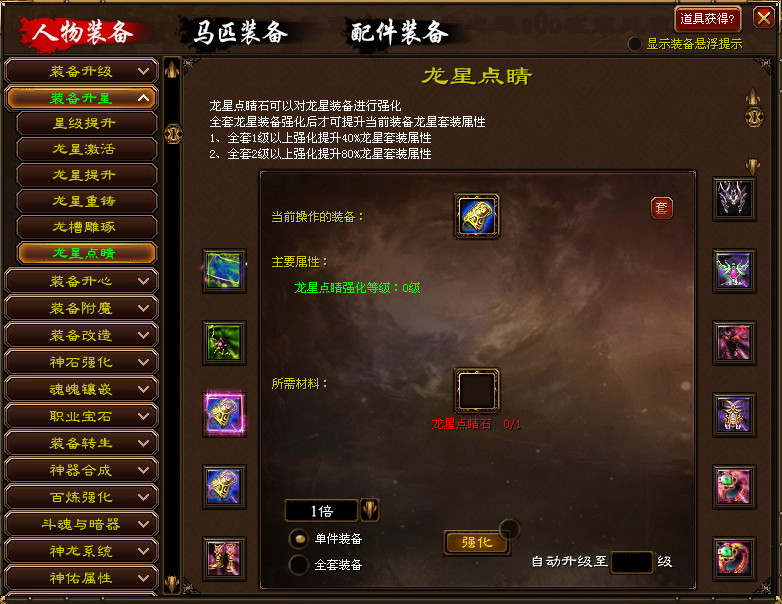 玩家可消耗龙星点睛石对龙星装备进行强化,当全套龙星装备强化等级达到指定要求时,将额外提升当前装备龙星套装属性。