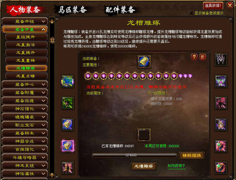 当装备解锁 15 孔龙槽后,玩家可消耗龙槽精粹对龙槽进行雕琢,提升龙槽雕琢等级可获得龙星效果加成与基础属性加成;当全身装备龙槽雕琢等级达到指定要求时,可激活额外套装属性与闪耀龙槽特效。