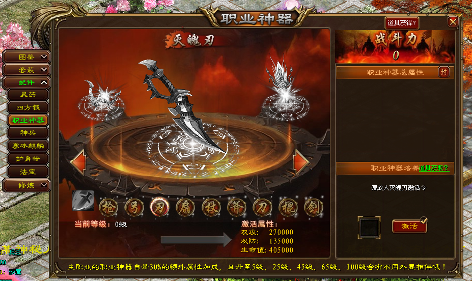 玩家可消耗对应职业的职业神器激活令,激活职业神器。