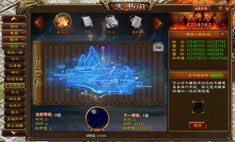 天书阁系统可大幅提升人物属性,玩家可消耗对应书籍的道具提升书籍等级,进一步强化人物属性。