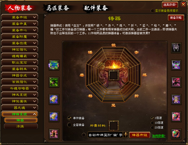 玩家可消耗血玉,按工序对装备进行铸器操作,完成全部工序后铸器成功;当全身 11 件装备完成相同品质铸器后,可激活铸器套装效果,获得额外属性加成。