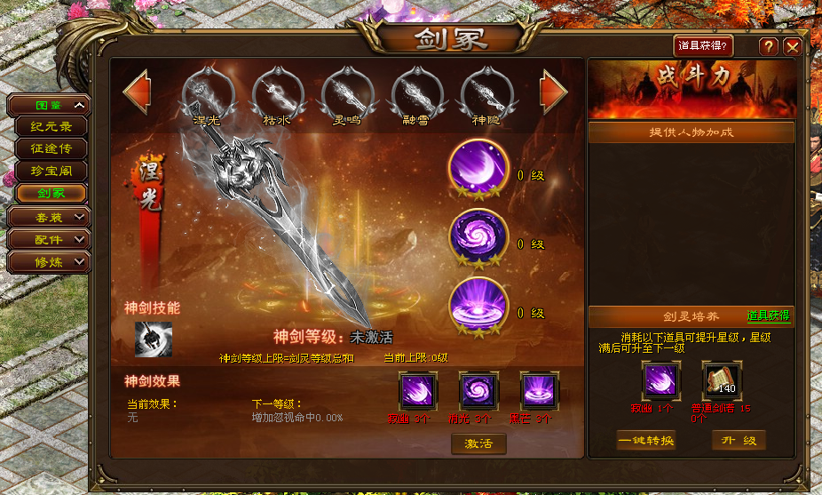 玩家可消耗各类神剑剑灵与普通剑谱、高级剑谱,激活并升级对应神剑,为角色提供大量属性加成与多种强力增益 buff。