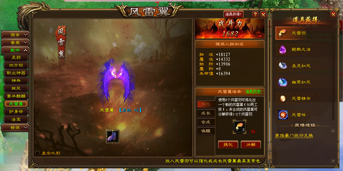 玩家可使用圣灵如风合成风雷翼,提升翅膀百分比属性值;也可使用圣灵羽或幽冥羽进行合成。