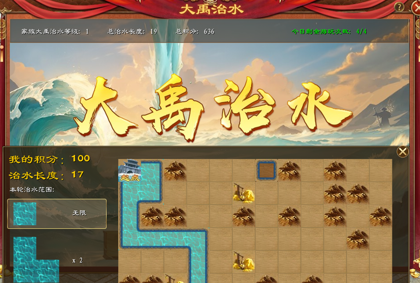 中原地带洪水泛滥,无边无际,淹没了庄稼,山丘,房屋,老百姓流离失所。征途的勇士们快来帮助被洪水淹没的老百姓,挖掘一条通往大江大海的路,以此来缓解持续增长的水位。挖掘的通道越短获得通过积分就越多,沿路如有山脉阻碍则需绕行,挖掘的过程中有机会挖出普通矿脉,稀有矿脉增加积分,看看谁能成为那个治水能力最强的大禹家族。