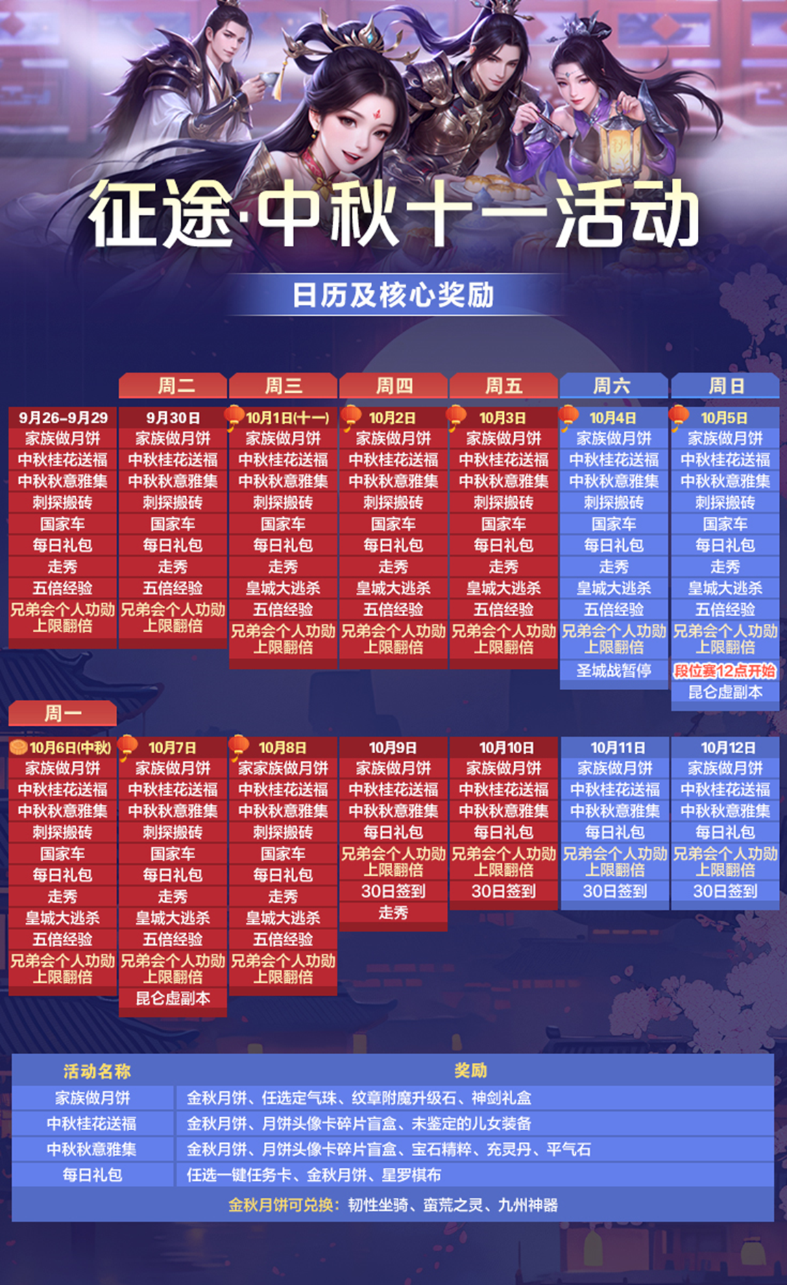活动奖励:金秋月饼(可兑换任选韧性坐骑、蛮荒之灵、九州神器)、月饼头像卡碎片盲盒、宝石精粹、充灵丹、平气石。