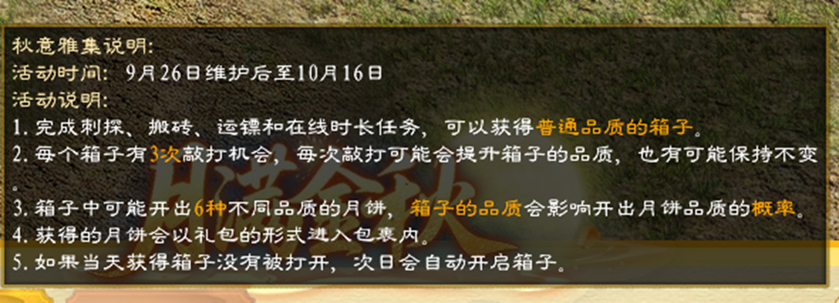 活动奖励:金秋月饼(可兑换任选韧性坐骑、蛮荒之灵、九州神器)、任选定气珠、纹章附魔升级石、神剑礼盒。