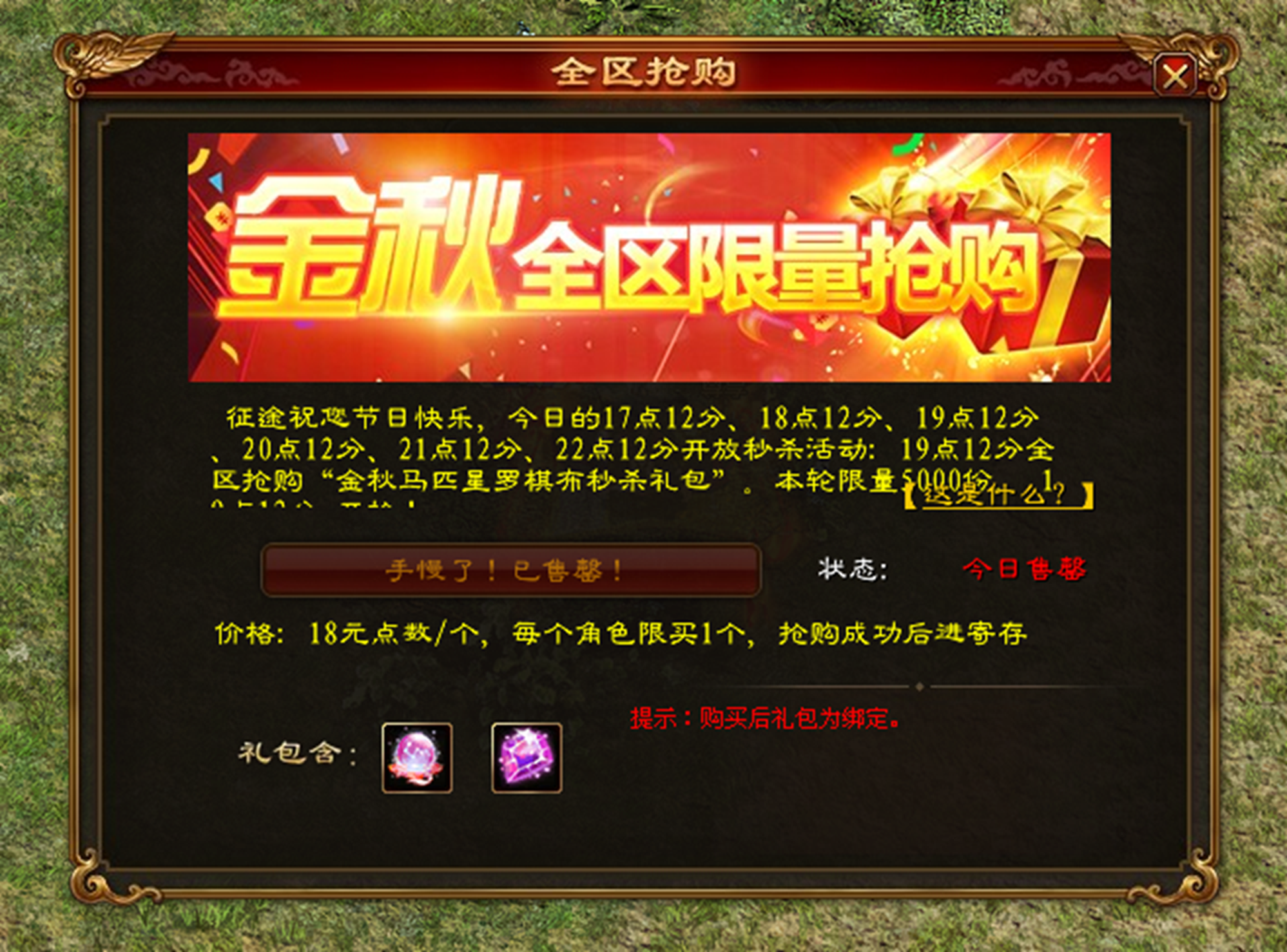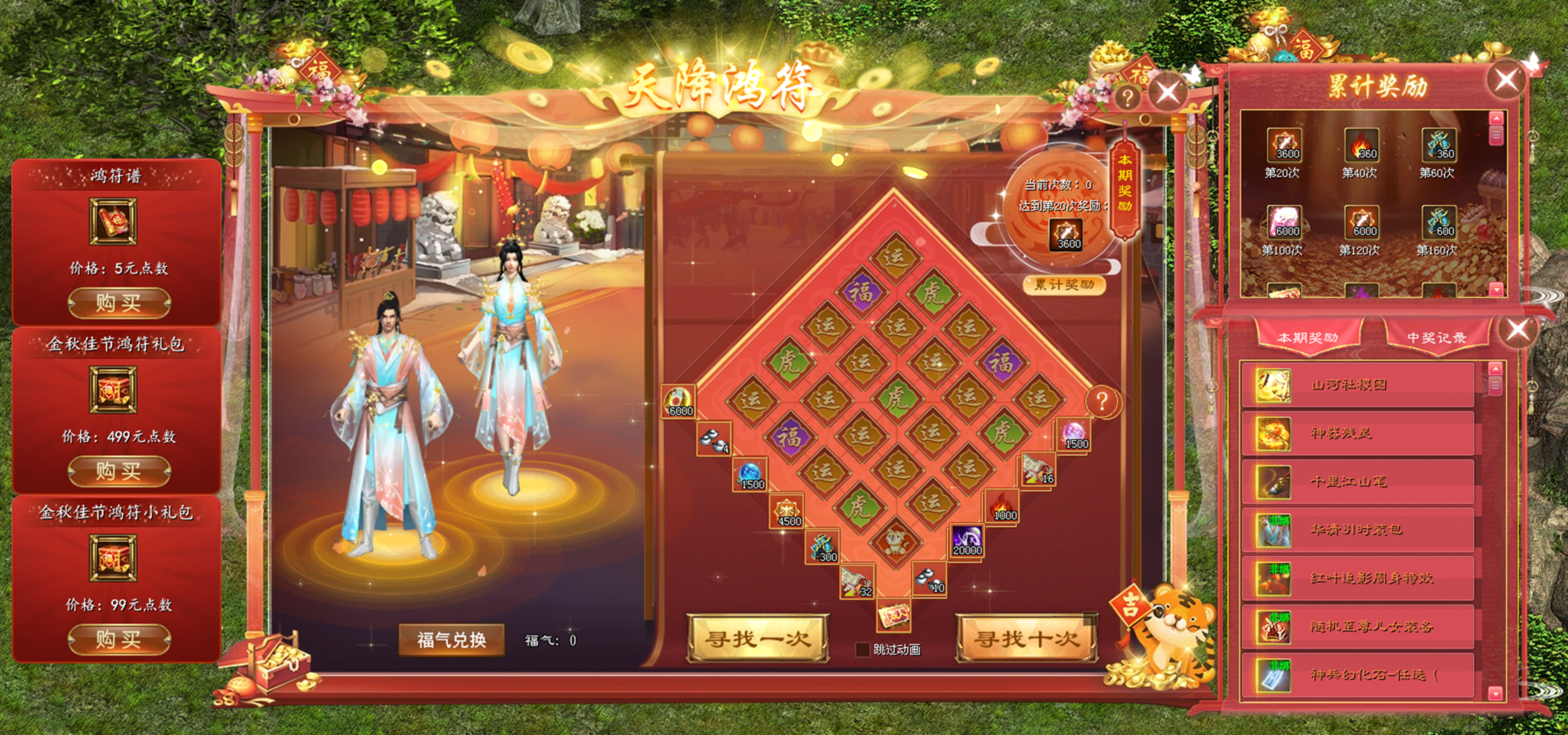 本期奖励新增山河社稷图、华清引时装包(非绑)、随机至尊儿女装备(非绑)、红叶追影周身特效(非绑)、神兵幻化石(非绑)、限量征途传-限量双节(非绑)等好礼!