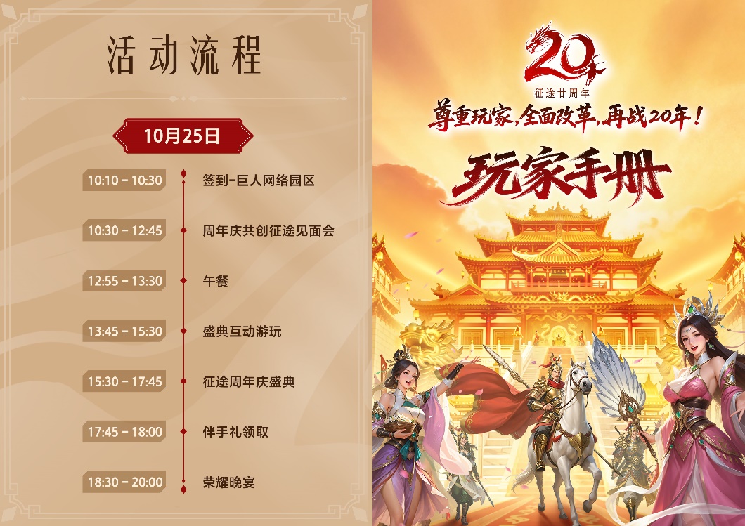 10月25日,征途20周年线下盛典将于巨人网络&巨人宴会厅重磅启幕,本次盛典以“尊重玩家,全面改革,再战20年”为主题,特别邀请近百名在征途20年历程中留下特别记忆的荣耀玩家来到现场。巨人网络董事长史玉柱现场赴约,征途IP赛道负责人赵剑枫还将带来重磅发布,与玩家共赴征途周年盛典!