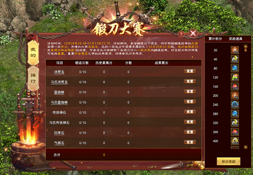 活动期间,各项目只计入前10次锻造/鉴定结果,对项目当前分数不满意,可花费一定非绑银进行重置,重置不会改变该项目的历史最高分和已有成果展示。