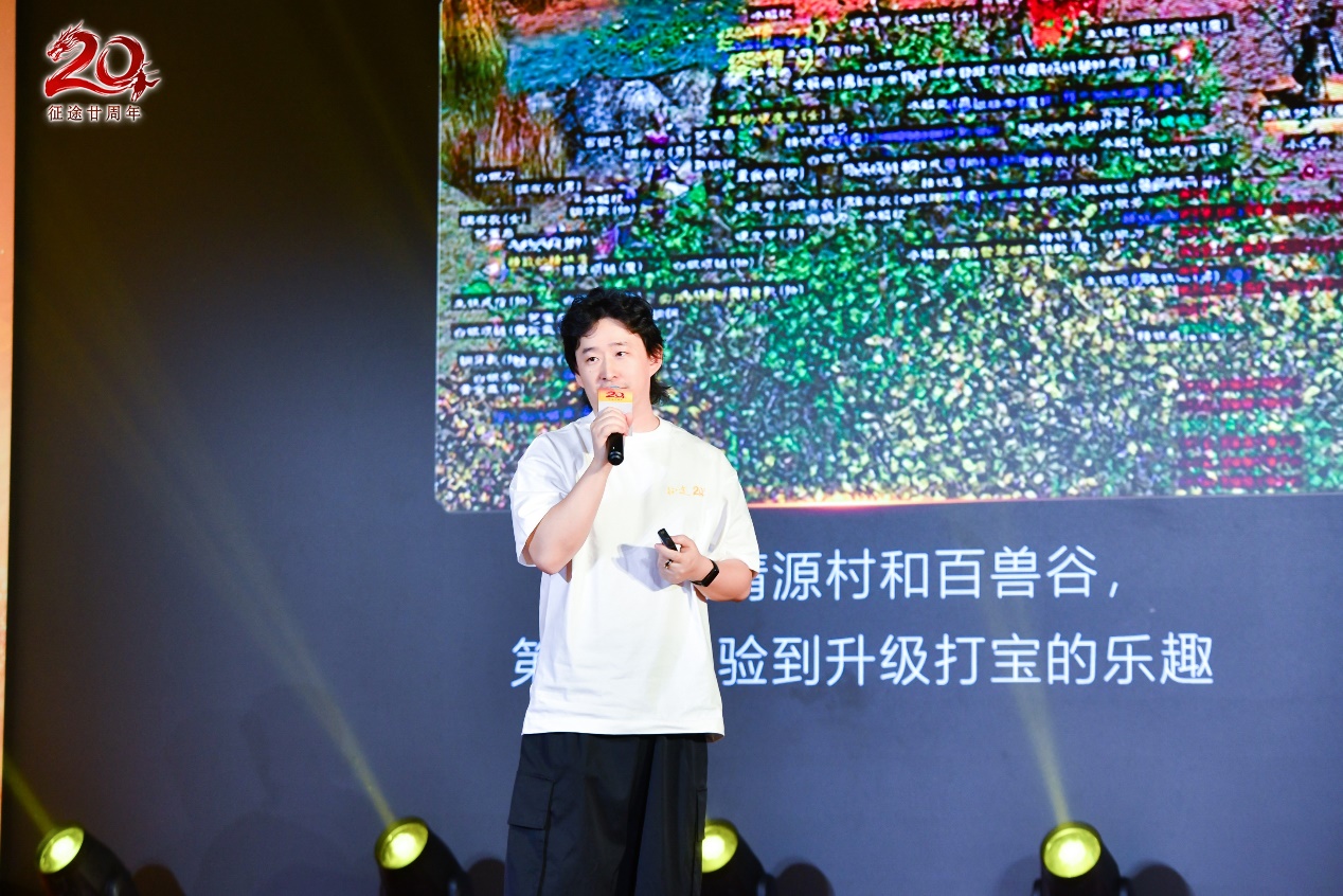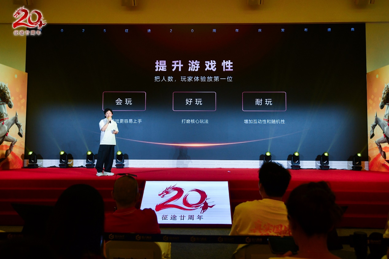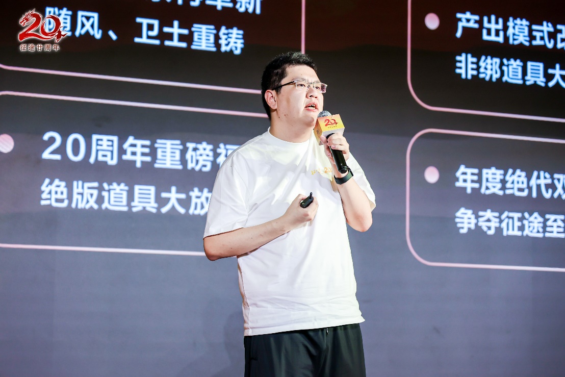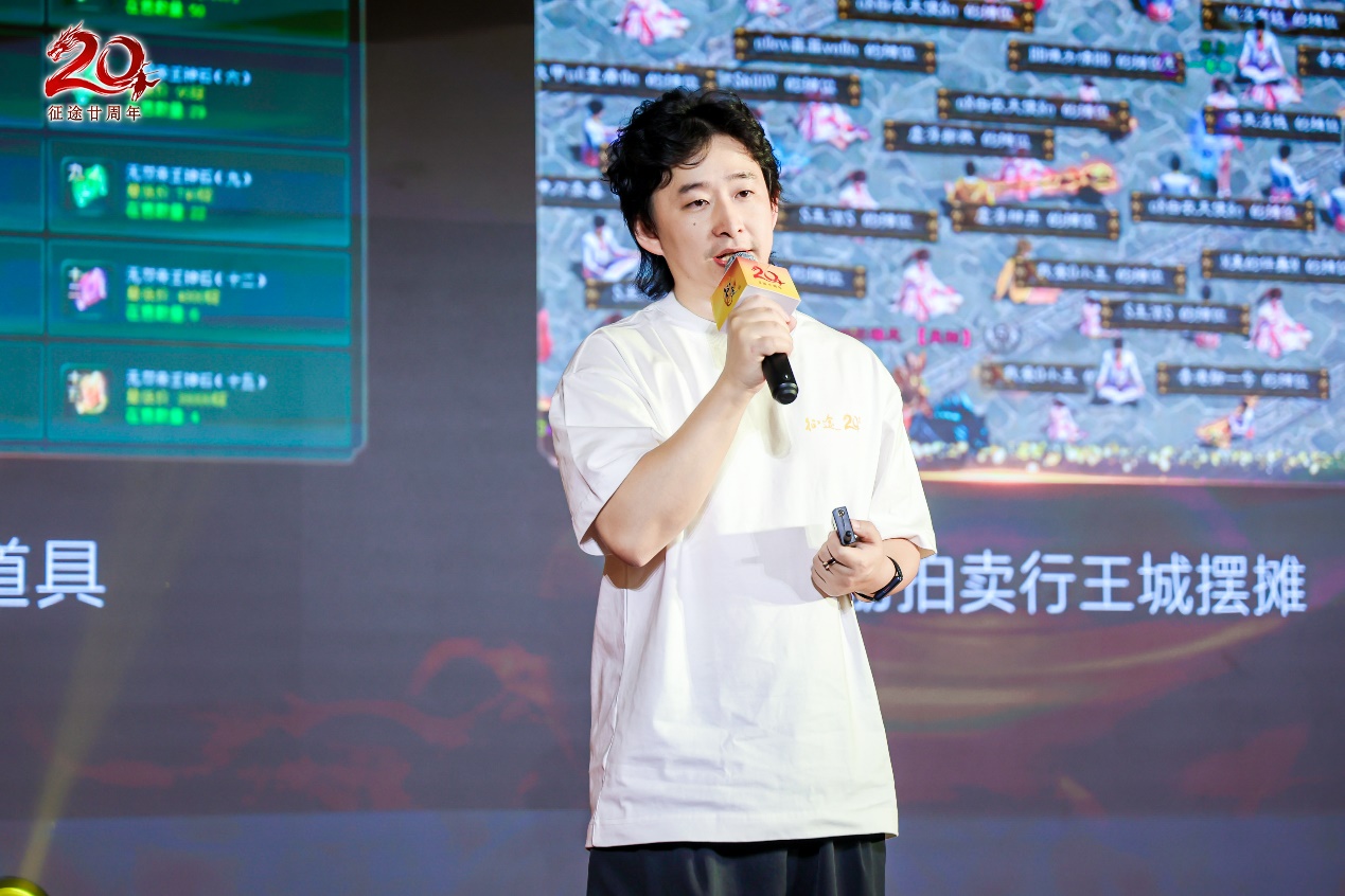 回望过去,放眼现在,征途也将继续展望未来。在主持人介绍下,征途IP赛道负责人赵剑枫上台,为大家带来了以“尊重玩家,全面改革,再战20年”为主题的征途20周年发布会。发布会上,赵剑枫与玩家们分享了二十载征途,专属于征途人的青春记忆,小到一张合影,大到一场国战都历历在目。