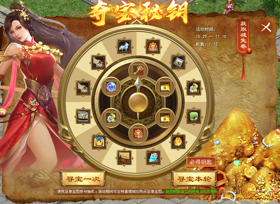 活动期间开启夺宝钥匙,本期奖励:全新套装“出师情”,全新韧性坐骑“器之魂附魔升级石”,龙星升星石12星,全新时装“悟空时装包”,全新“王者护符-夺宝版本(可兑换全新王者足迹激活石),”夺宝金券新增“神征途传六”,“和田石1级”,“孔雀石1级”兑换。全新至尊宝图特惠礼包,内含“至尊宝图”100个。