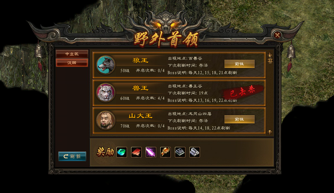 ■挑战野外BOSS:狼王、兽王、山大王、异族头目等野外BOSS每天整点准时刷新,等待勇士挑战,点击游戏界面右上方“首领”按钮即可查看刷新时间与地点。成功击杀,即有丰厚奖赏:祝福石、技能书残页、紫色装备、无暇升级宝石、铁、银… 各类养成材料尽入囊中!
