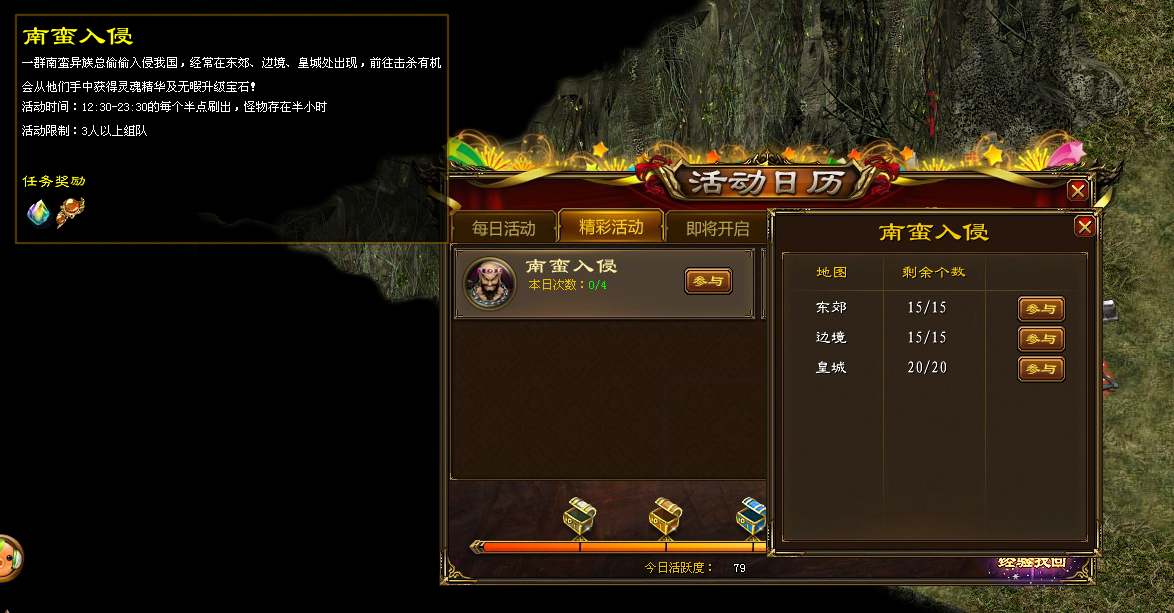 ■抵御南蛮入侵:南蛮异族妄想入侵我国,前往东郊、边境、皇城,3人以上组队抵御南蛮入侵,即有机会从他们手中获得灵魂精华、无暇升级宝石。点击游戏界面右上方“活动”按钮,打开“精彩活动”界面,查看南蛮入侵活动情报。