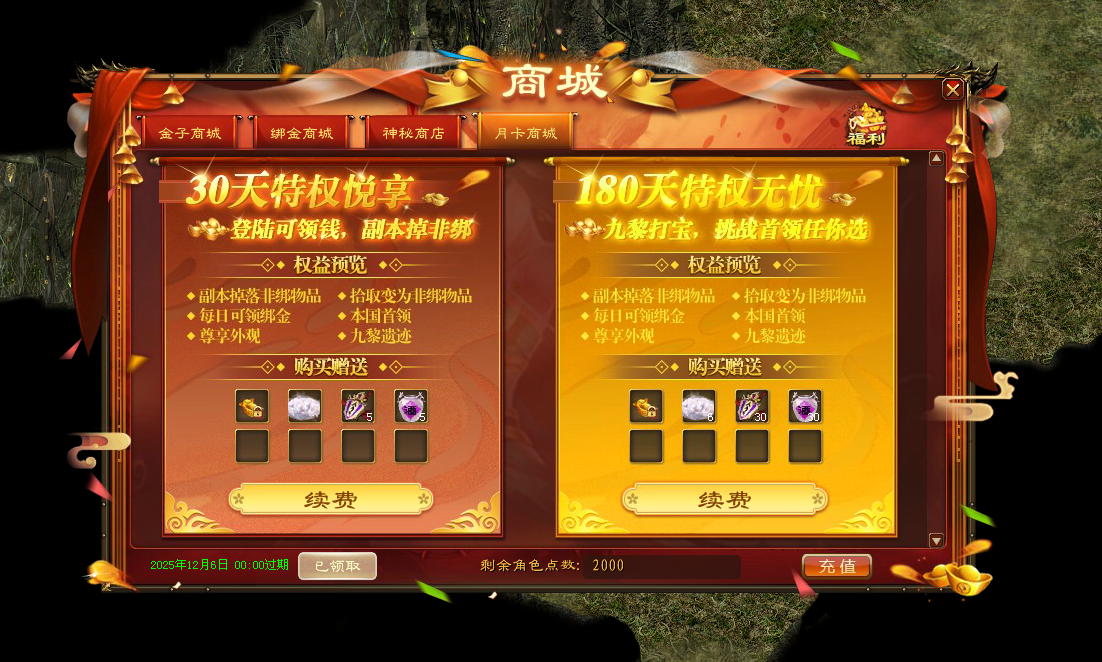 ■掉非绑交易自由:月卡加持下,BOSS、副本掉落的道具拾取将变为非绑物品!以往绑定的刚需道具材料,如今均可通过交易卖给其他玩家,BOSS掉落的紫色装备、技能书残页,九黎秘境爆的升星宝石、各色打造材料,都能变现为真金白银!