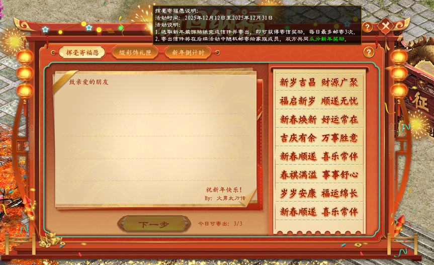 1、在2025年12月12日至2025年12月31日期间选取祝福贴纸完成信件并寄出可获得每日寄信礼包,奖励内容包含山海神器-补天石和山海神器-封天印。