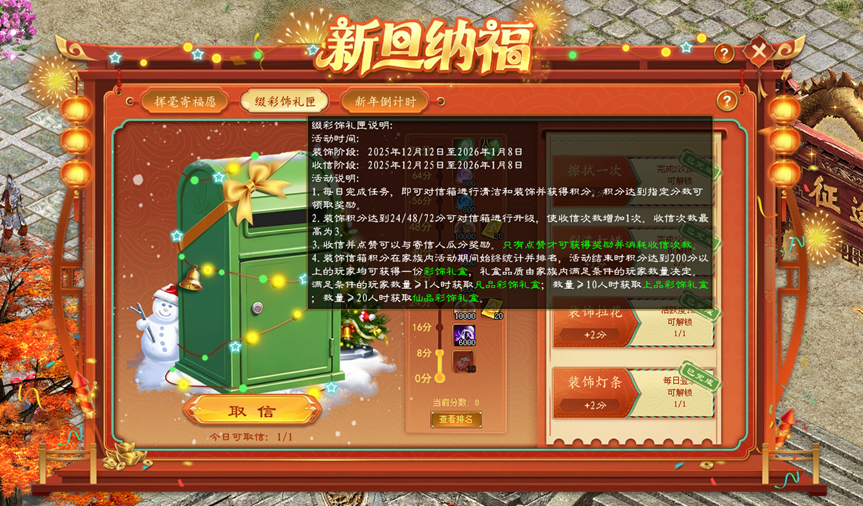 3、在2025年12月12日至2026年1月8日期间,每日完成指定任务即可获得装饰信箱积分。积攒积分可逐阶段兑换积分奖励,达到24、48、72分时还可解锁每日收信次数,最大收信次数为3次。累计积分可获得劫运神石、8级开天神石等惊喜奖励。