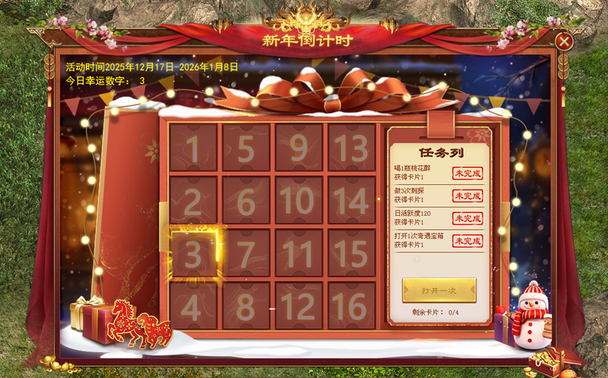 6、在2025年12月17日至2026年1月8日期间可参与新年倒计时活动。完成任务列表中的任务,获得卡片,每集齐4张卡片可以打开一个礼物盒。每日会有一个幸运格子,翻到幸运格子处礼物盒的人可以获得双倍奖励,集齐全部格子还可获得收集大奖。奖励内容包括新表情坐骑、金卡(绑定版)、冬日礼券等。