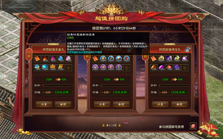 本次超值拼团购打开礼包可额外获得经典时装焕新抽奖券,使用抽奖券有概率获得焕新版部落、牛仔、唐装/旗袍、燕尾服时装包(非绑)。