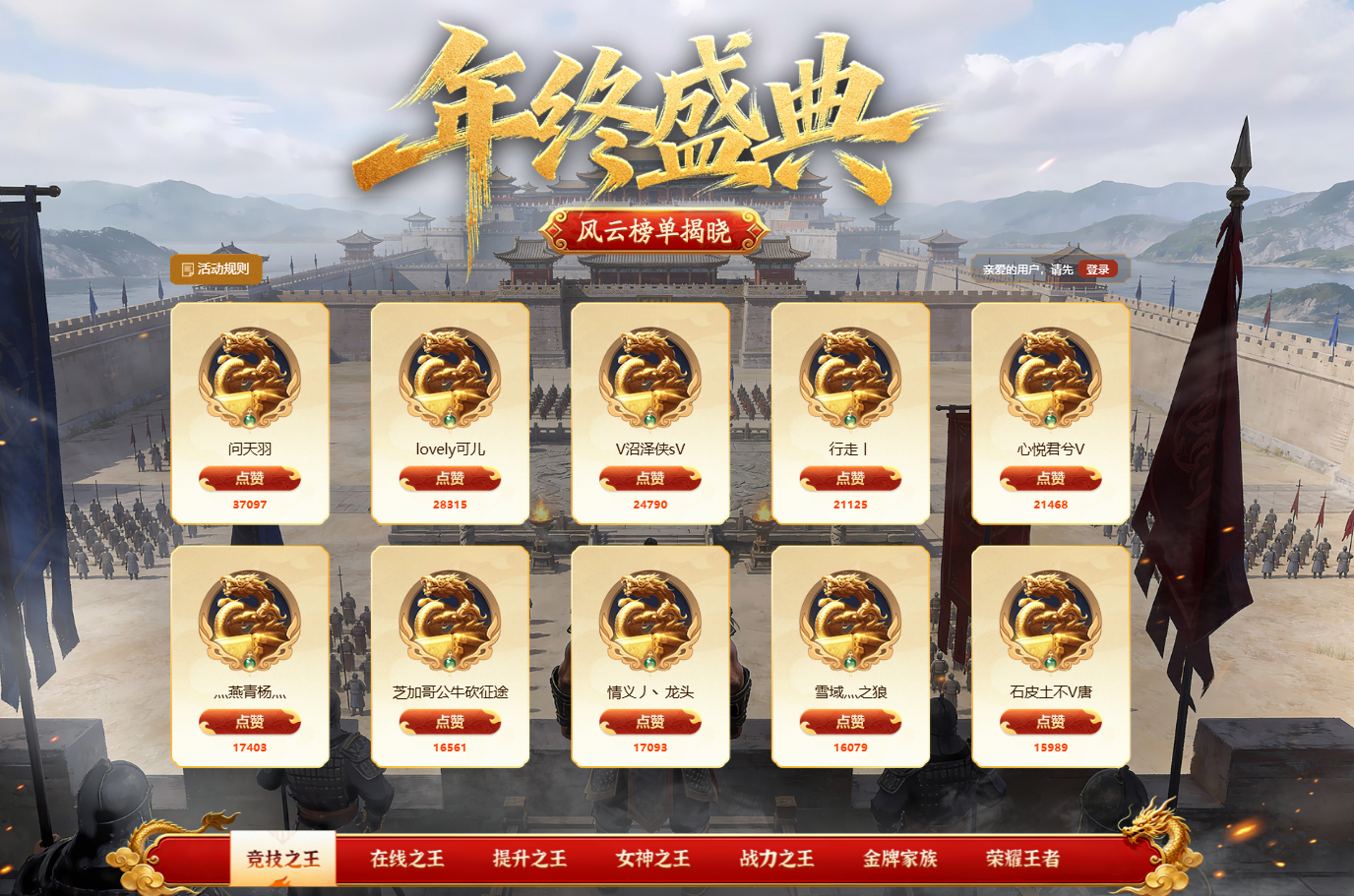 ■年终风云榜:七大榜单全面记录了过去一年中,在不同领域取得非凡成就的征途风云人物!将军们可为上榜英雄点赞互动,有机会获得实物周边、风云人物送出的点赞礼包,共享荣耀时刻!