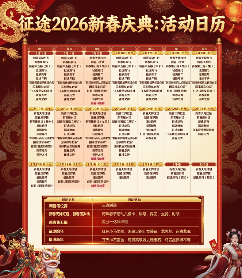 2026年2月9日-3月1日春节专属活动期间,每周登录互通端的礼包奖励加码,额外增加新春红包商城点数、开天神石盲盒等丰厚奖励,每周福利不间断,助力勇士新春提战,畅玩征途!