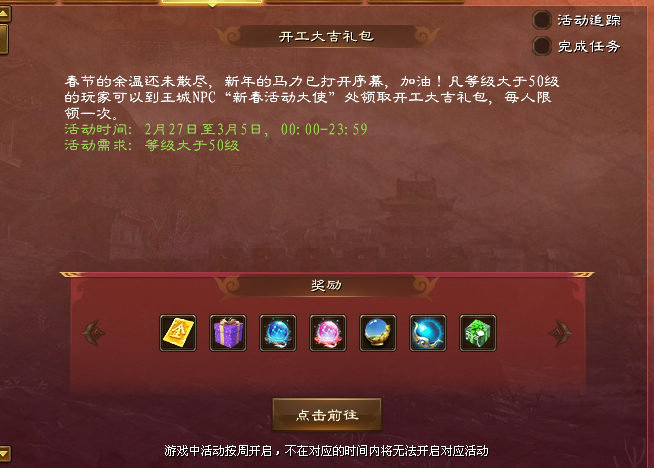 等级大于50级的玩家,可以到王城NPC”新春活动大使“处领取开工大吉礼包,每人限领一次。