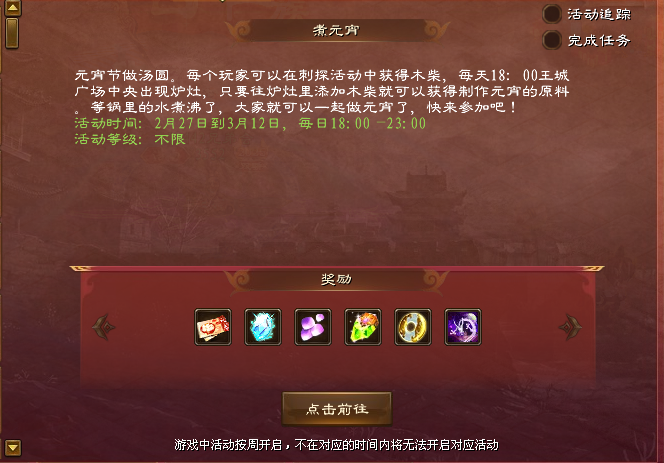 元宵节做汤圆!活动期间,参与刺探活动,获取煮元宵的木柴(每完成1次刺探活动产出1个木柴)。