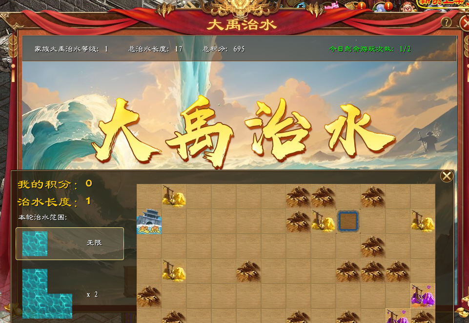 中原地带洪水泛滥,无边无际,淹没了庄稼,山丘,房屋,老百姓流离失所。征途的勇士们快来帮助被洪水淹没的老百姓,挖掘一条通往大江大海的路,以此来缓解持续增长的水位。挖掘的通道越短获得通过积分就越多,沿路如有山脉阻碍则需绕行,挖掘的过程中有机会挖出普通矿脉,稀有矿脉增加积分,看看谁能成为那个治水能力最强的大禹家族。