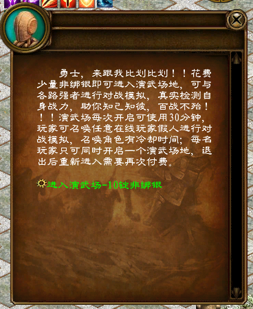 演武砺雄兵,对决见真功!全新演武场上线,可前往王城-演武场传送使者处花费10锭非绑银进入演武场地,在场地中输入全区其他在线玩家名称,即可召唤该玩家假人进行演武测试,召唤冷却为1分钟。演武场使用期间可同时在游戏窗口正常进行游戏,演武场场景存在30分钟时间限制。