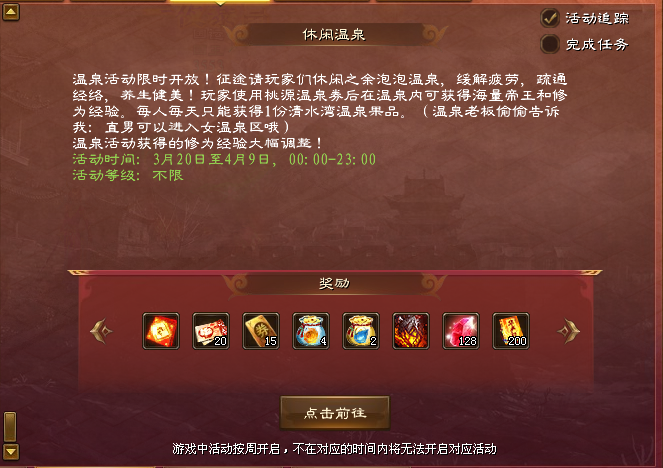 温泉活动限时开放!玩家使用桃源温泉券后在温泉内可获得海量帝王和修为经验。每人每天只能获得 1 份清水湾温泉果品。