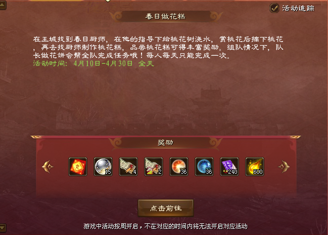 活动期间,在王城找到NPC春日厨师,在他的指导下给桃花树浇水,赏桃花后摘下桃花,再去找春日厨师制作桃花糕,品尝桃花糕可得丰富奖励。