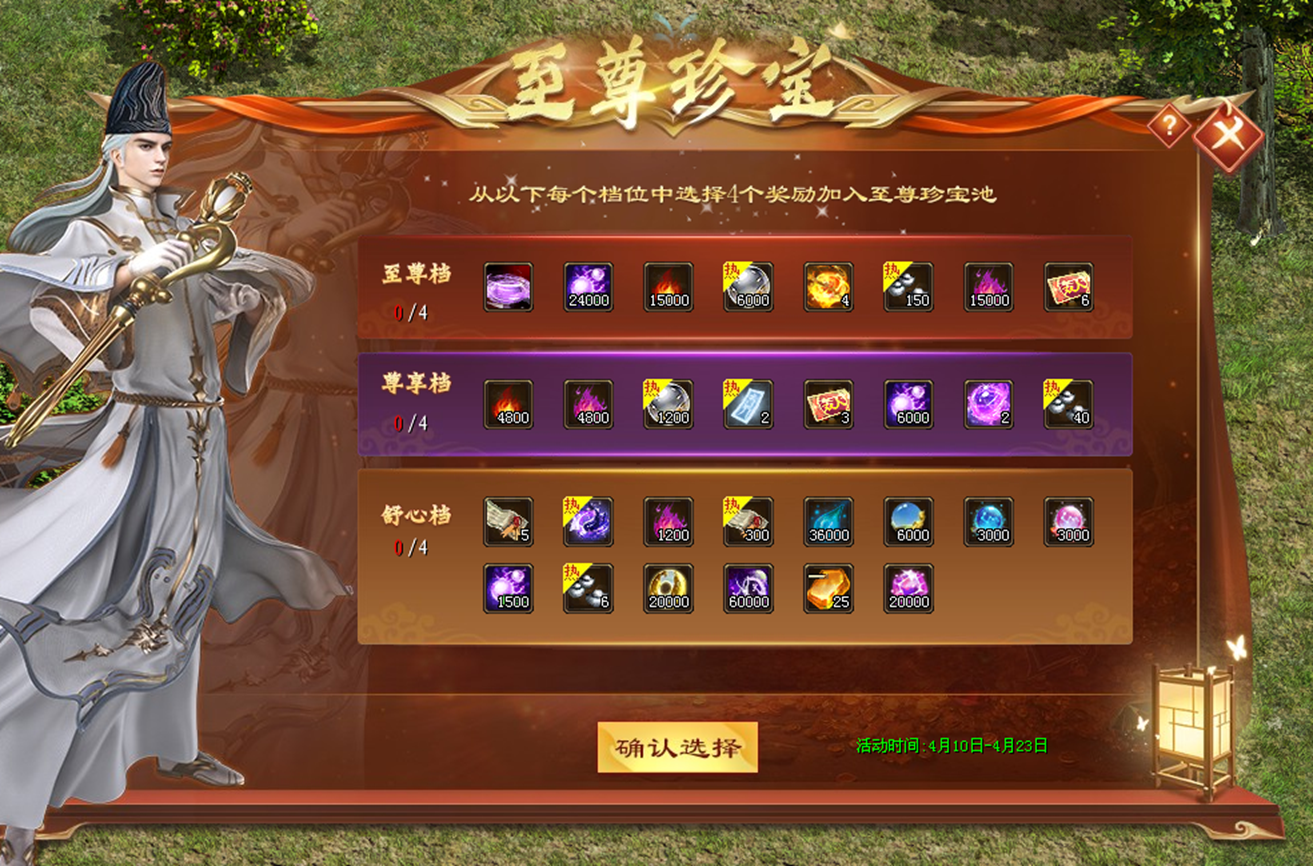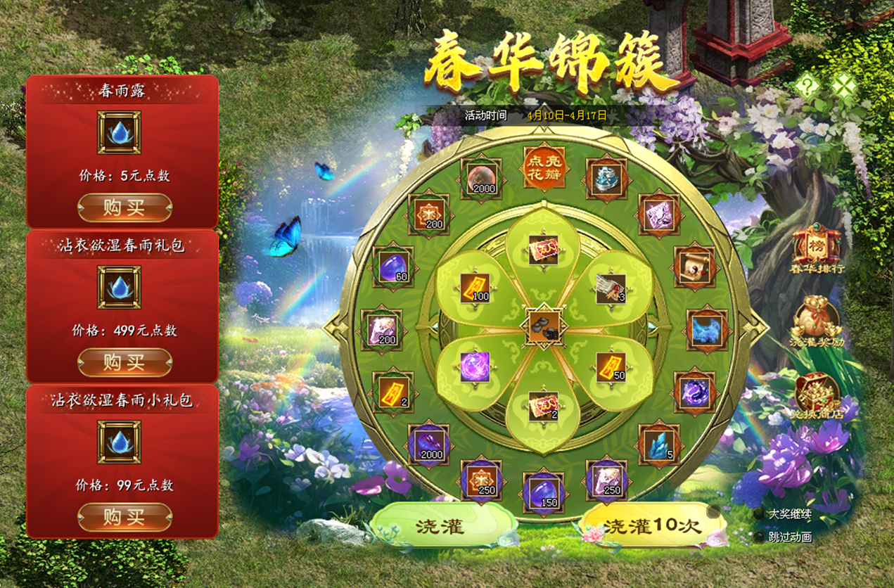 本期奖励新增限量征途传-春日踏青(非绑)、神器之灵·蹄铁、龙鳞附魔激活石(非绑)、龙鳞附魔升级石、星幻灵猫(非绑)。