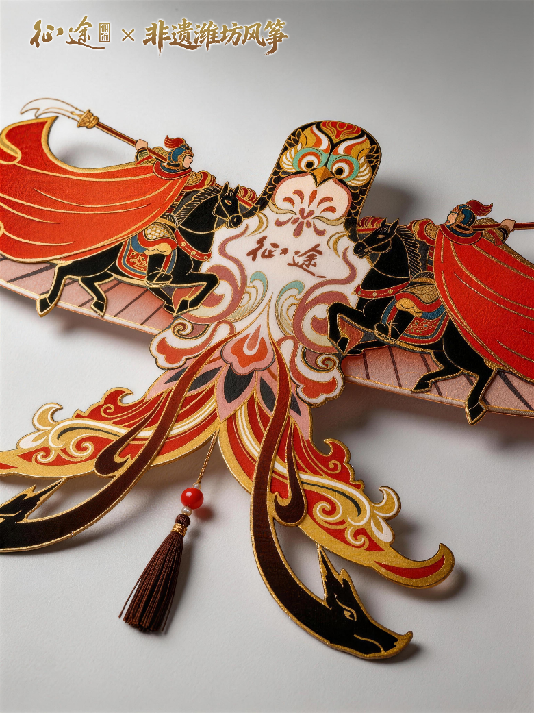 征途IP定制风筝以征途经典的“战马”、“将军”元素为灵感,竹骨凝匠心,彩纸绘豪情,既彰显潍坊风筝的传统底蕴,也彰显出了二十一年征途的热血记忆。