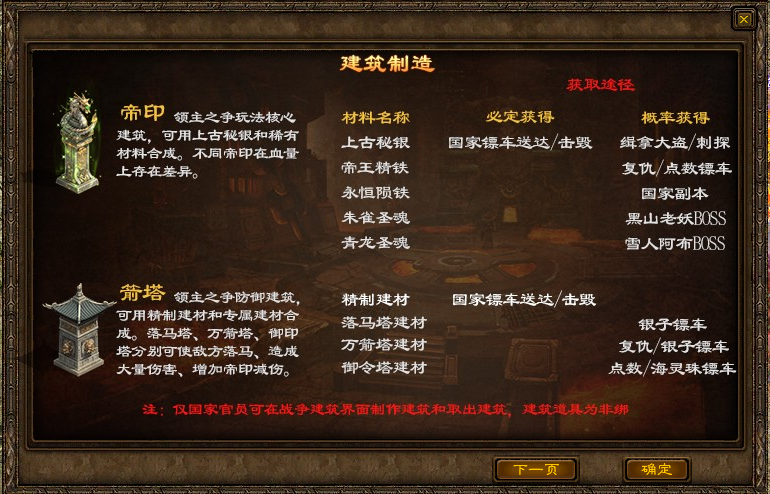 箭塔、帝印材料产出对应活动调整,在原有 9 类任务基础上,新增刺探、复仇、国家国民砍爆国家镖车三大任务。建筑更新,已建造的历史旧建筑可在随身兑换中折旧兑换为新建筑物。