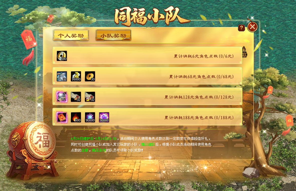 答:即使没有加入小队,4月24日维护后活动期间的点数消耗仍会统计,并在加入一只同福小队,同时确认组队后生效。个人奖励无需加入小队,自动发放。
