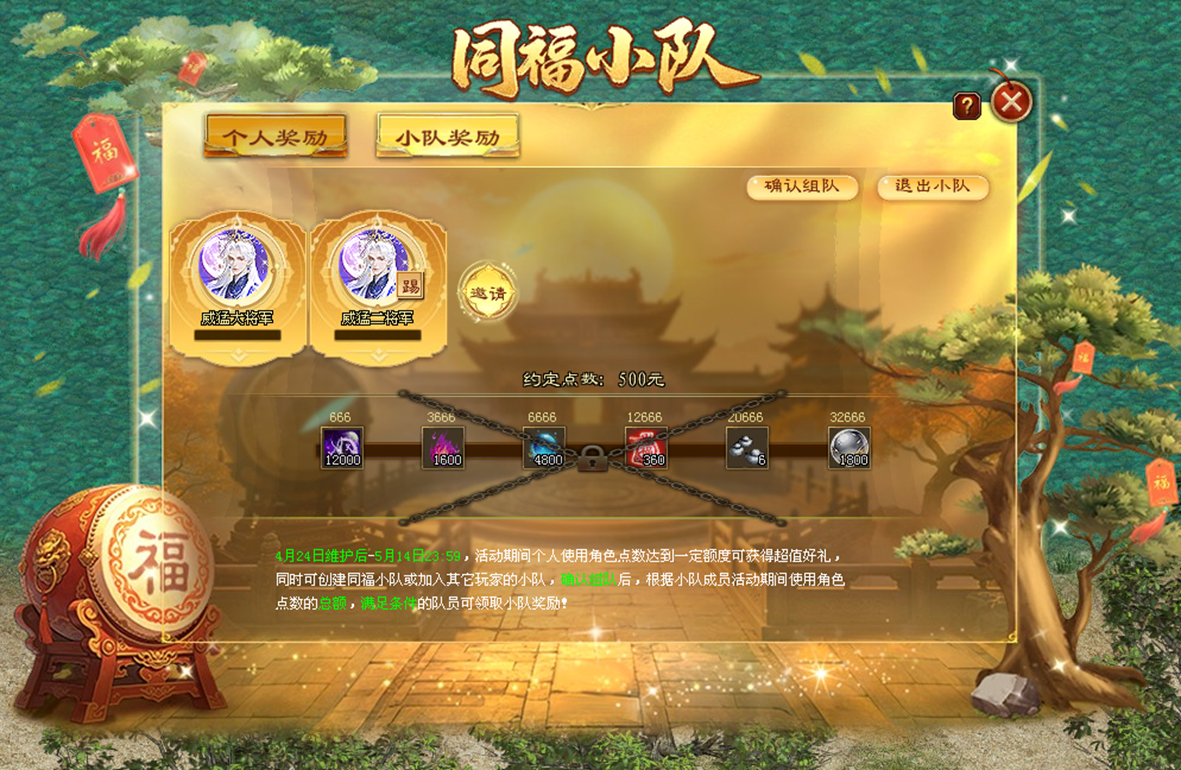 同时可选择创建同福小队成为队长或加入其它玩家的同福小队,小队队长可发起组队确认,确认后小队正式成立,全队成员活动期间使用角色点数达到一定额度可激活小队奖励,个人使用点数达到小队约定点数的成员可手动领取。