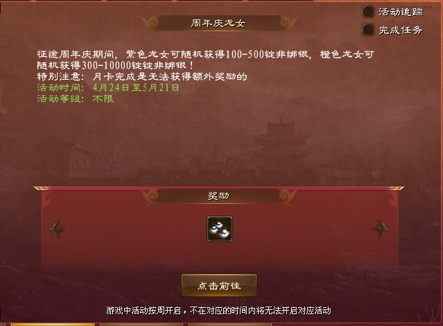 奖励:非绑银、任选韧性坐骑、任选装备字纹(第二套)、龙凤契、远古龙魂等。
