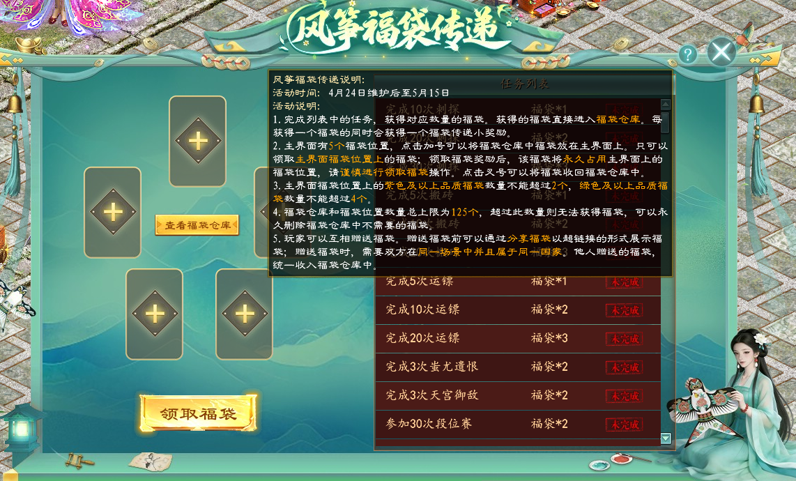 完成任务获得福袋,参与风筝福袋传递活动,即可免费获得坐骑潍坊x征途纸鸢。