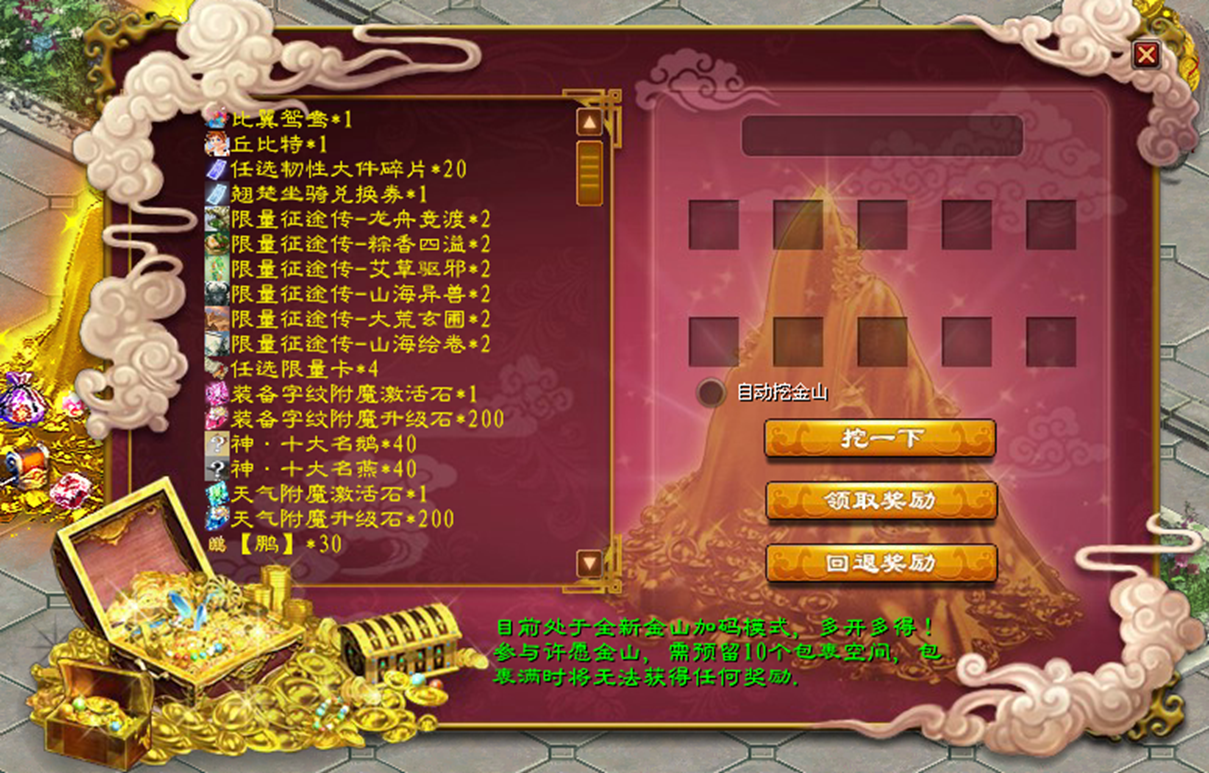 活动期间,礼包商城上架黄金锄花包,打开可获得非绑黄金锄*69、龙凤契*20、慕情花*99、郁金香*999、蓝色妖姬*5200。