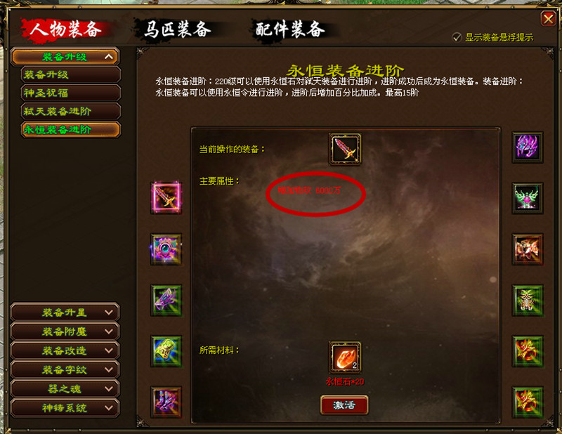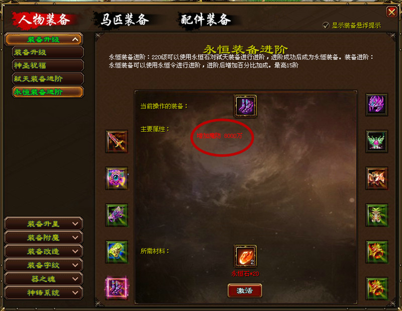 然后玩家在C界面点击“装备引导”,在装备升级一栏中,选择“永恒装备进阶”一项,打开专属界面,用鼠标点击需要激活的装备,然后下方空格内,会自动显示主包裹内当前拥有的永恒石数量。每激活一件装备,需要永恒石20个。