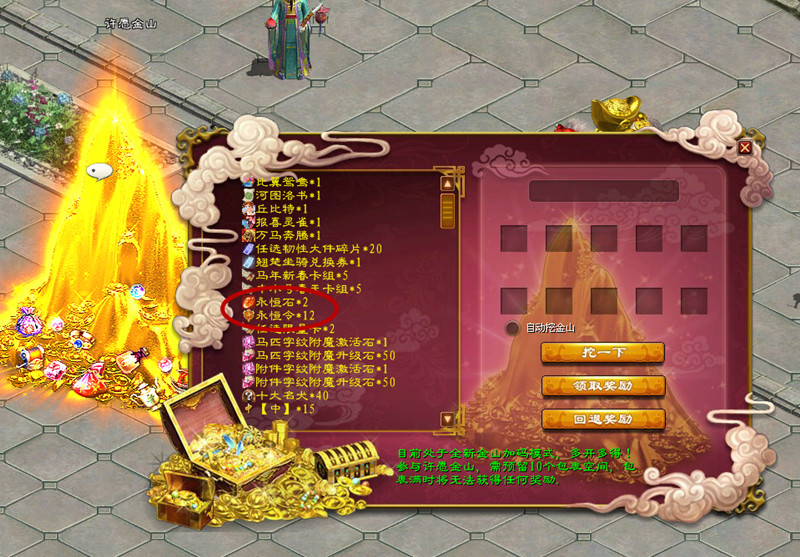 如果你挖金山获得永恒石不够时,可以从其他玩家手中收购非绑的永恒石,凑齐20个后,即可成功激活一件装备,该装备将升级为永恒装备,可增加海量的属性。